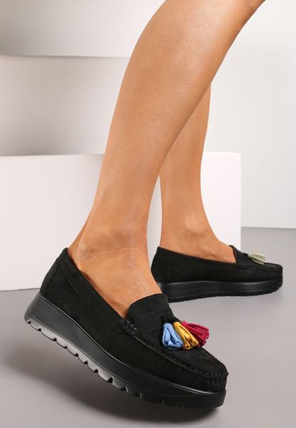 Czarne Półbuty ze Skórzaną Wkładką z Frędzlami i Podeszwą z Wycięciami Cesua