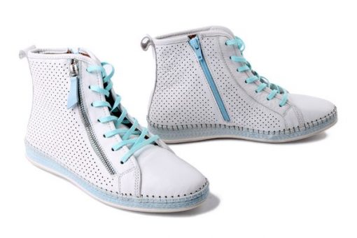 Skórzana cholewka. Perforowana cholewka. Wymienna wkładka. Elastyczna podeszwa. Niebieskie dodatki.