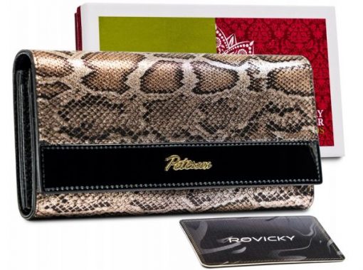 Odszyty bardzo trwale z doskonałej jakości skóry naturalnej. Portfel o klasycznej stylistyce imitujący skórę węża. Model w orientacji poziomej zapinany na zatrzask. Wyposażony w technologię RFID BLOCKING SYSTEM.