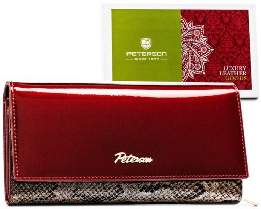 Elegancki, lakierowany portfel damski Peterson ze skóry naturalnej łączy styl z funkcjonalnością. Dzięki licznym przegródkom łatwo uporządkujesz karty i gotówkę, a technologia RFID chroni Twoje dane przed kradzieżą. Idealny wybór na co dzień!
