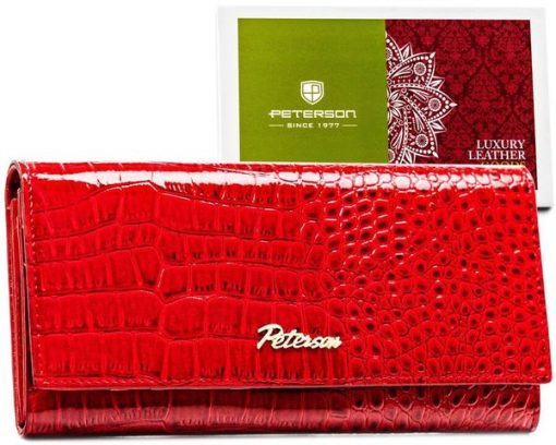 Elegancki portfel damski Peterson ze skóry naturalnej, wyposażony w zatrzask i ochronę RFID, zapewnia bezpieczeństwo kart płatniczych. Wyróżnia się trwałością, dużą ilością przegródek oraz wyjątkowym, luksusowym designem. Zapakowany w logowane pudełko.