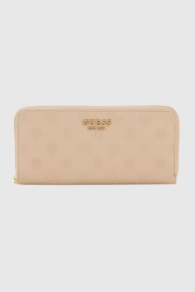 Beżowy damski portfel ze skóry ekologicznej marki Guess. Zamykany na zamek, wewnątrz zasuwana kieszeń na bilon, dwie przegrody, 12 miejsc na karty, dwie wsuwane kieszenie i dodatkowa kieszeń na zamek z tyłu.