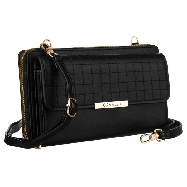 Torebko-portfel z wysokiej jakości skóry eko. W tym modelu znajdują się przegródki na karty płatnicze lub dokumenty wielkości karty. Z przodu kieszonka na telefon zapinana na zatrzask. Torebka wyposażona w długi odpinany pasek.