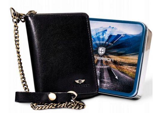 Uszyty z wysokogatunkowej skóry naturalnej o gładkiej fakturze. W portfelu znajdziesz mnóstwo miejsca na dokumenty i gotówkę. Portfel zawieszony jest na długim i solidnym łańcuszku. Wyposażony w system RFID.