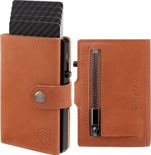 KORUMA Skórzany portfel męski z kieszenią na bilon oraz aluminiowym etui z wysuwanymi kartami (brązowy) Uniwersalny