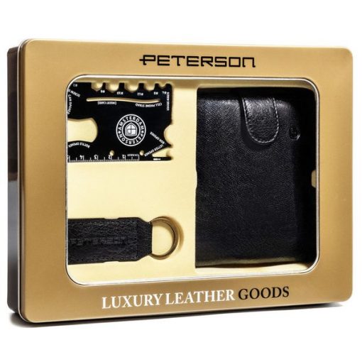 Elegancki zestaw prezentowy Peterson: portfel męski ze skóry naturalnej z ochroną RFID, praktyczna karta survivalowa z wieloma funkcjami i brelok skórzany. Portfel zawiera wiele kieszonek na karty, sekcje na gotówkę i miejsce na dowód rejestracyjny.