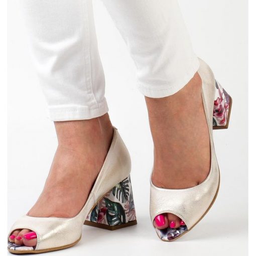 Złote skórzane Polskie czółenka damskie na słupku z odkrytymi palcami Deoni D511