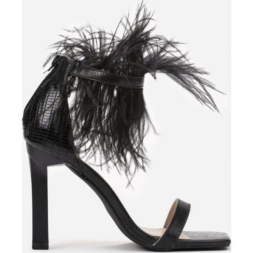 Sandały Sheissa wykonane z ekoskóry oraz osadzone na wysokim, słupkowym obcasie. Tył zabudowany, zapinany na zamek błyskawiczny. Z kwadartowym, otwartym noskiem. Wokół kostki cienki, elastyczny pasek ozdobiony supermodną imitacją piór. Stylowe i szykowne sandałki znakomicie się sprawdzą do eleganckich outiftów glamour!
