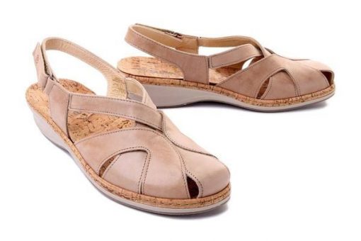 Sandały profilaktyczne damskie. Skórzana cholewka. Skórzana, wyprofilowana, częściowo perforowana wkładka. Wyjmowana wkładka mocowana na specjalne wpusty. Zapięcie na rzep. Gumy ściągające. Elastyczna, trwała podeszwa TR. Koturn z systemem Air Function.