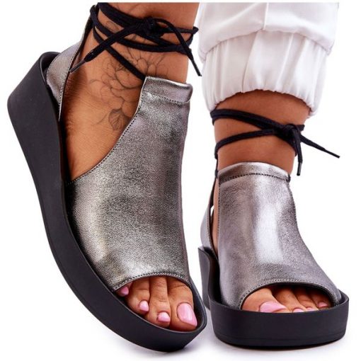 Skórzane Sandały Na Koturnie Nicole 2743/063 Srebrno-Czarne