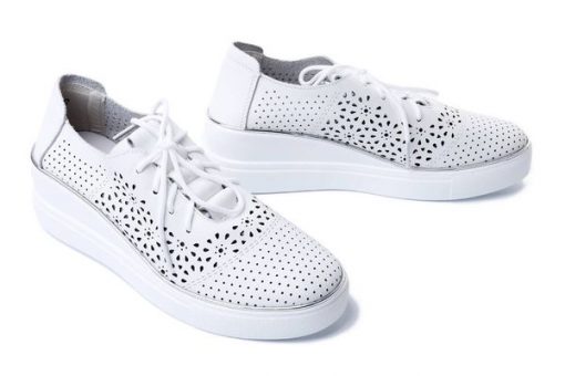 Półbuty letnie damskie. Naturalna skóra. Perforowana cholewka. Miękka, skórzana wkładka. Sznurowanie. Wygodny, stabilny koturn.