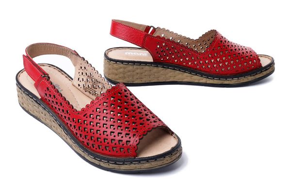 Sandały damskie. Naturalna skóra. Ażurowa cholewka. Miękka, skórzana wkładka. Zapięcie na rzep. Wygodny koturn.