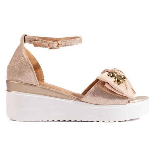 Seastar Złote damskie sandały na koturnie z kokardką złoty