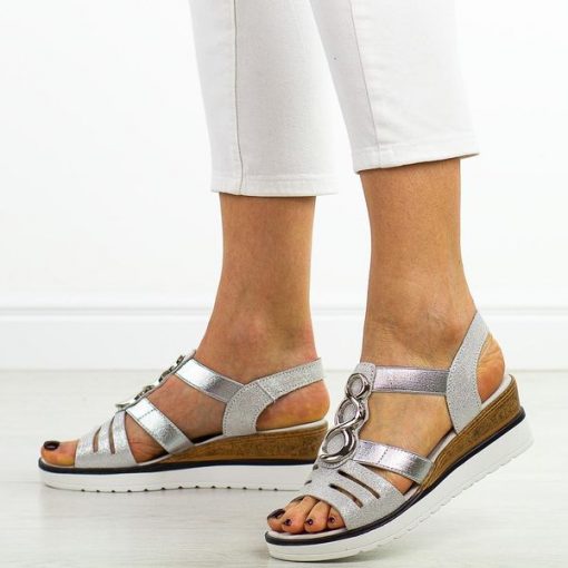 Srebrne skórzane sandały damskie na koturnie T.Sokolski 619