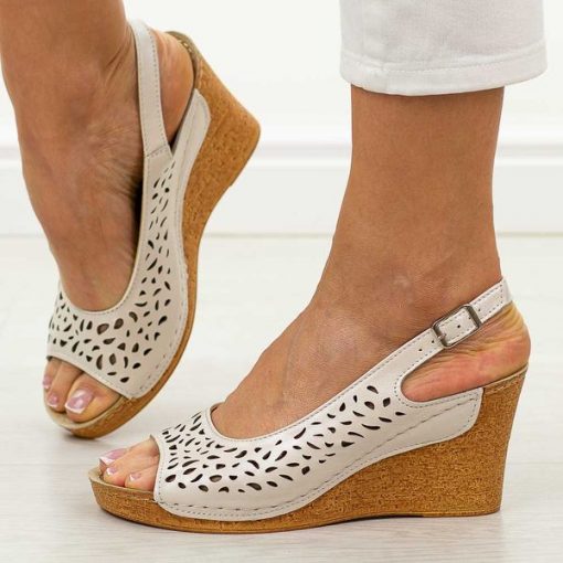 Perłowe skórzane Polskie sandały damskie na koturnie Gregors 1142