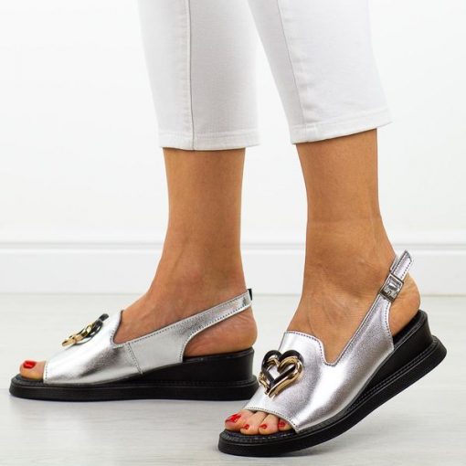 Srebrne skórzane sandały damskie na koturnie T.Sokolski 664