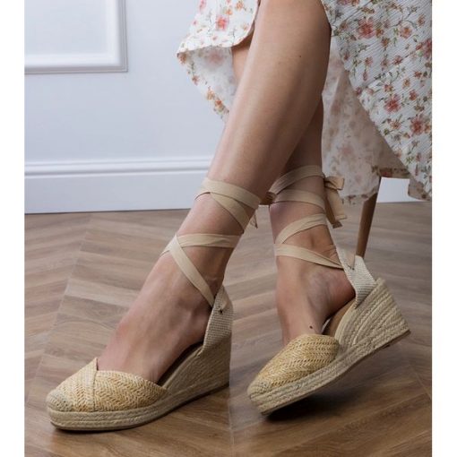 Beżowe sandały espadryle wiązane na koturnie beżowy