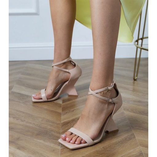 Beżowe sandały z paskiem na geometrycznym koturnie beżowy