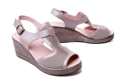 Sandały damskie. Naturalna skóra. Ażurowa cholewka. Miękka, skórzana wkładka. Zapięcie na klamerkę. Guma ściągająca. Wygodny koturn. Tęgość G.