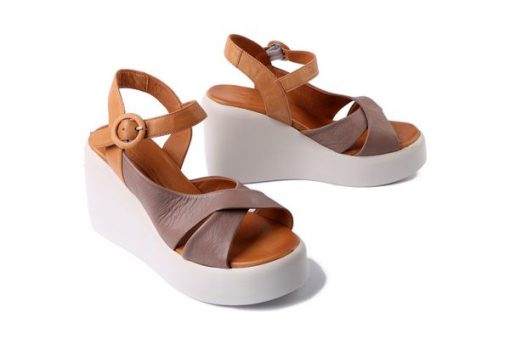 Skórzana cholewka. Wysoki koturn. Sprzączka. Modny design. Brązowy kolor.