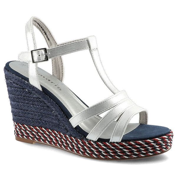 Sandały damskie Tamaris, wykonane z materiału syntetycznego i tekstylnego i plecioną koturną z wyraźnie zaznaczoną platformą, białe metaliczne, 1-283