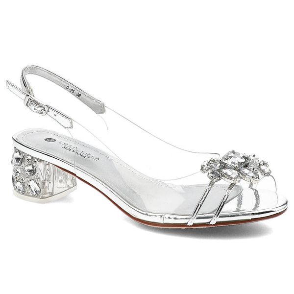 Sandaly damskie Scaviola, osadzone na stabilnym obcasie z dekoracyjnym wypełnieniem i ozdobną aplikacją na przodzie, srebrne, G-25