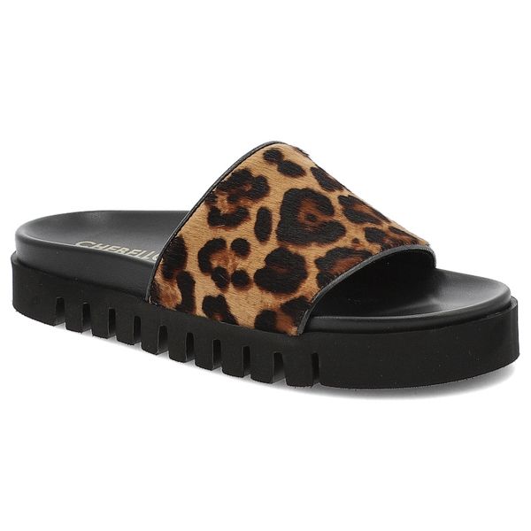 Klapki damskie Chebello, ze skóry naturalnej na grubej platformie w panterkę, brązowe, 4685-525
