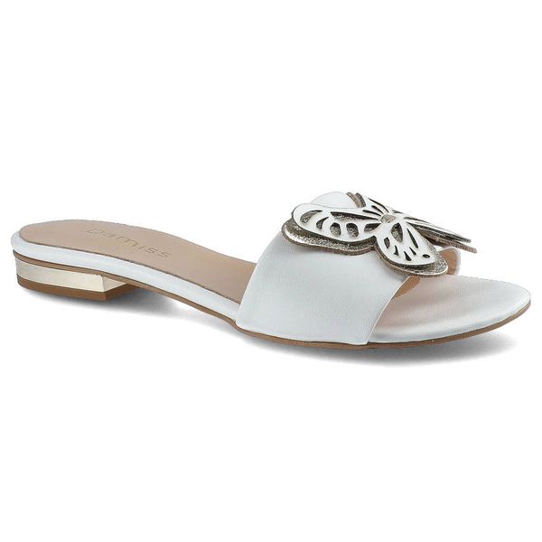 Klapki damskie Damiss, naturalna skóra licowa w białym kolorze z szerokim paskiem zdobionym ażurową metalową aplikacją oraz niską płaską podeszwą z d