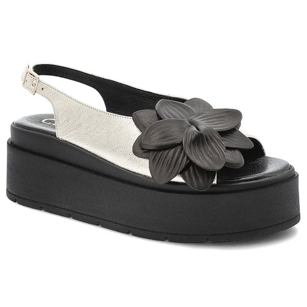 Sandały damskie Chebello, skórzane na gruej platformie z ozdobnym kwiatem i ze sprzączką, złoto-czarne, 4645-046
