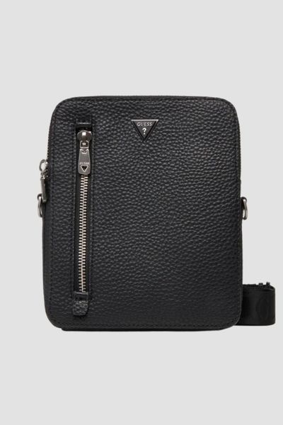 Czarna saszetka męska Milano marki Guess, wykonana z wysokiej jakości skóry ekologicznej. Wyposażona w regulowany pasek, jedną pojemną komorę główną, dwie zewnętrzne kieszenie na zamek oraz dwie wewnętrzne kieszenie wsuwane. Uniwersalna i wygodna – idealna na co dzień i w podróży.