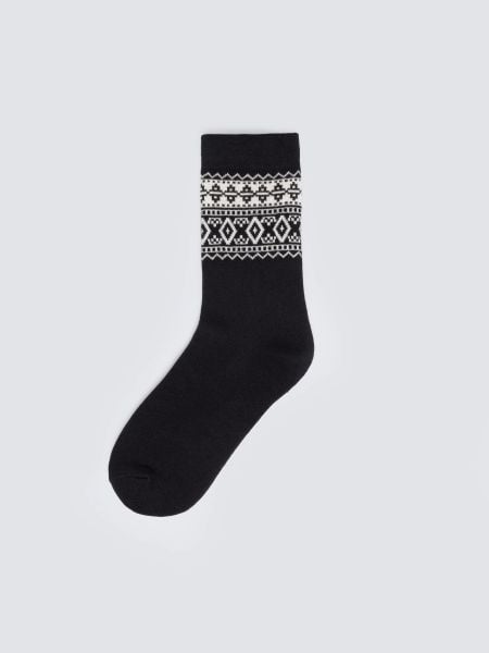 Klasyka w zimowym wydaniu – długie, czarne skarpetki z żakardowym wzorem inspirowanym skandynawskim folklorem. Miękka przędza o wysokiej zawartości bawełny gwarantuje komfort i trwałość, a elegancki czarny kolor sprawia, że są idealnym dodatkiem do każdego stroju, od casualowego po elegancki.