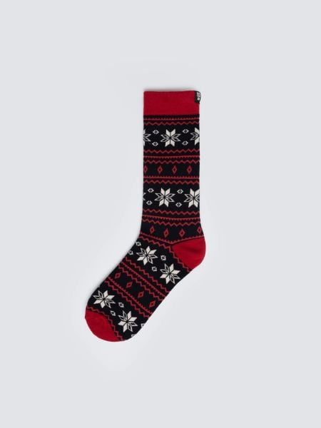 Stylowe męskie skarpety o żakardowym splocie z motywem skandynawskim w czerwono-czarnej kolorystyce. Wykonane z przędzy o wysokiej zawartości bawełny, gwarantują komfort i oddychalność przez cały dzień. Ściągacz ozdobiony miękką naszywką z logo marki podkreśla ich oryginalny charakter. Idealne do zimowych stylizacji i codziennego noszenia.