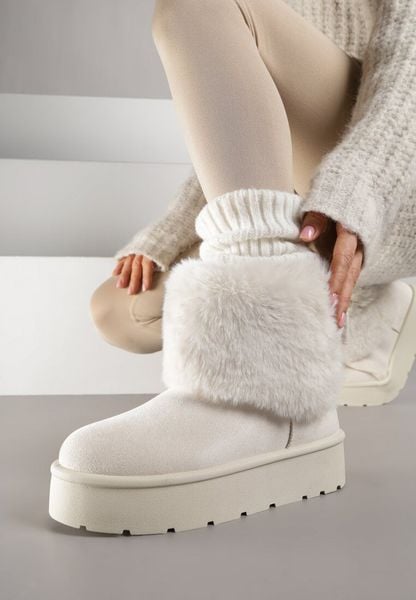 Beżowe Śniegowce z Cholewką za Kostkę Ocieplane z Futerkiem i Małą Kokardą Reinedia