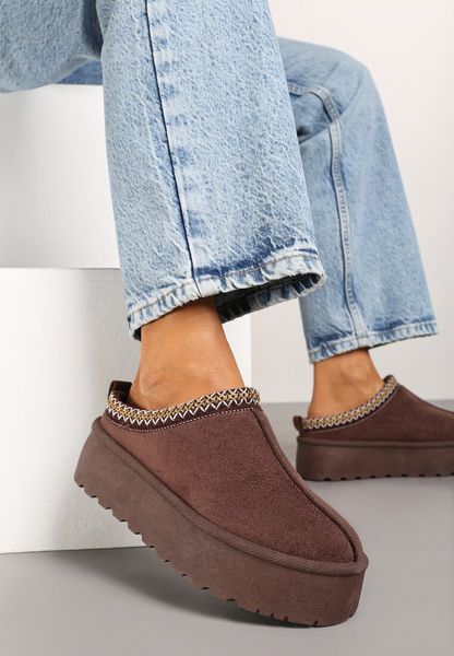 Brązowe Niskie Śniegowce na Grubej Podeszwie Zdobione Haftem Levitte