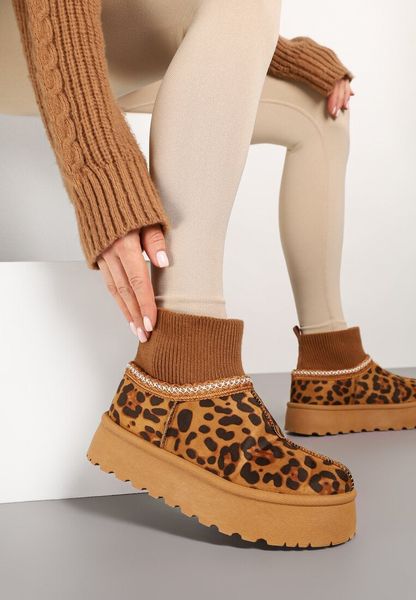Panterkowo-Brązowe Śniegowce na Platformie ze Skarpetową Cholewką Erevelis