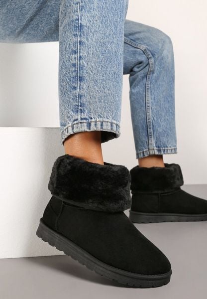 Czarne Śniegowce na Płaskiej Podeszwie z Ozdobnym Futerkiem Polida