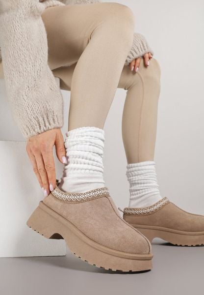 Beżowe Śniegowce z Ekozamszu na Platformie z Niską Cholewką z Ozdobnym Haftem Garvia