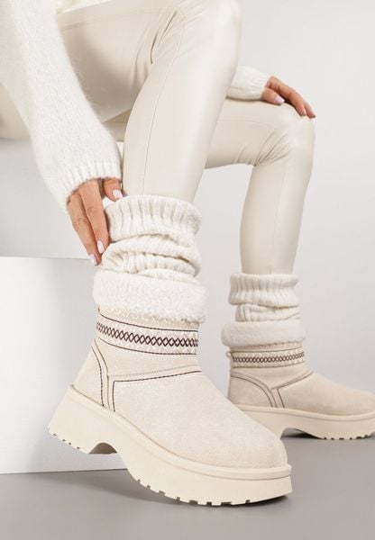 Beżowe Wsuwane Śniegowce Zdobione Hafem i Futerkiem Miosadia