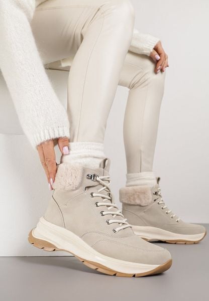 Beżowe Sznurowane Śniegowce Vices na Grubej Podeszwie Ozdobione Futerkiem Nomizola