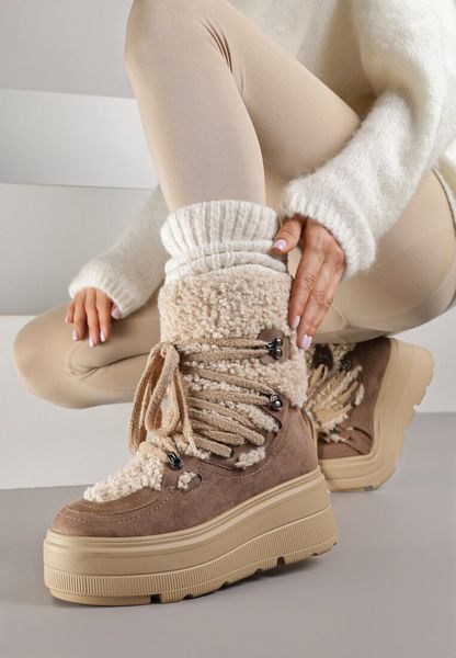 Ciemnobeżowe Wsuwane Śniegowce na Platformie z Futerkiem i Sznurowaniem Ettarie