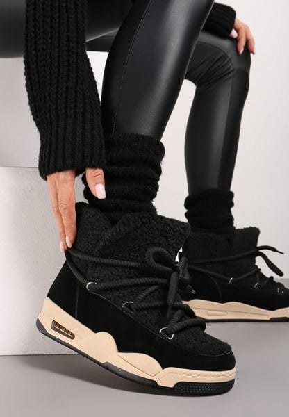 Czarne Wsuwane Śniegowce ze Sznurowaniem i Futerkiem Typu Baranek Meviatesa