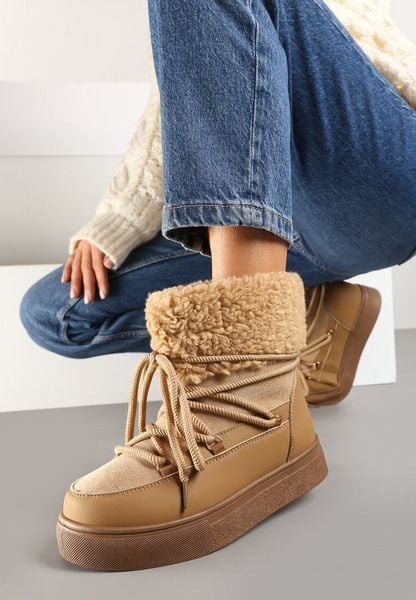 Jasnobrązowe Sneakersy Śniegowce Vices na Grubej Podeszwie Ozdobione Futerkiem i Napisem Nelinena