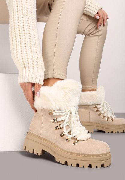 Beżowe Traperki na Tłoczonej Podeszwie z Futrzaną Wyściółką Leathriel