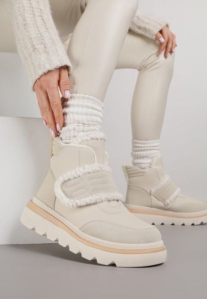 Beżowe Śniegowce Ozdobione Futerkiem i Przeszyciami Newelara