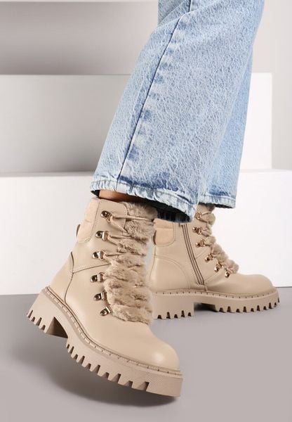 Ciemnobeżowe Sznurowane Traperki z Ekozamszu z Futerkiem na Języku Mestiara
