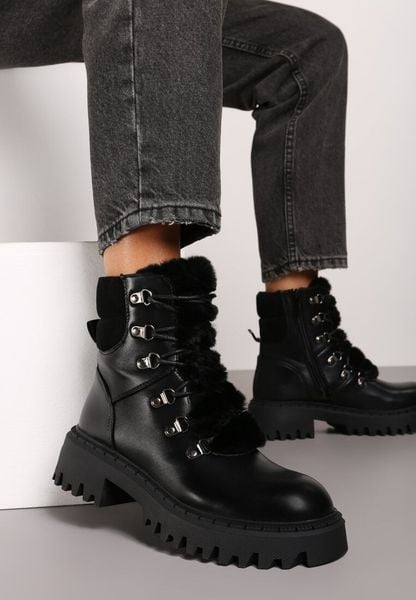 Czarne Śniegowce Traperki na Platformie z Tłoczeniem Ozdobione Futerkiem Heloma