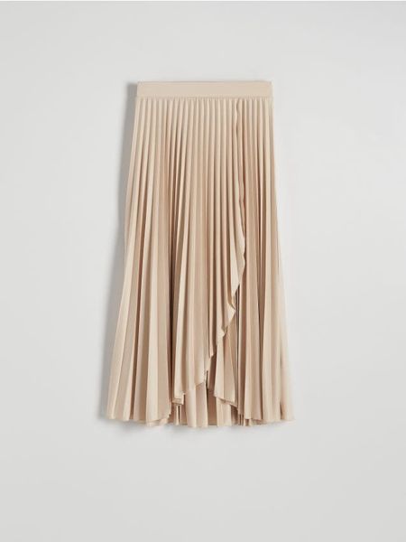 Spódnica o kopertowym fasonie, wykonana z plisowanej dzianiny.