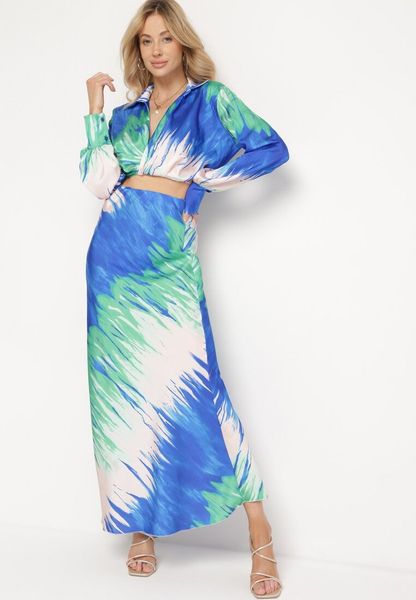 Zielono-Granatowy Letni Komplet Krótka Koszula z Przeplatanym Dekoltem Spódnica z Gumką w Pasie Wedna