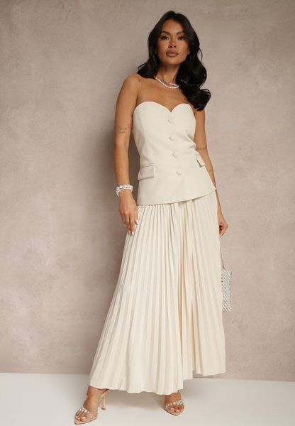 Jasnobeżowa Rozkloszowana Spódnica z Gumką w Talii Zdobiona Plisami Firlimi