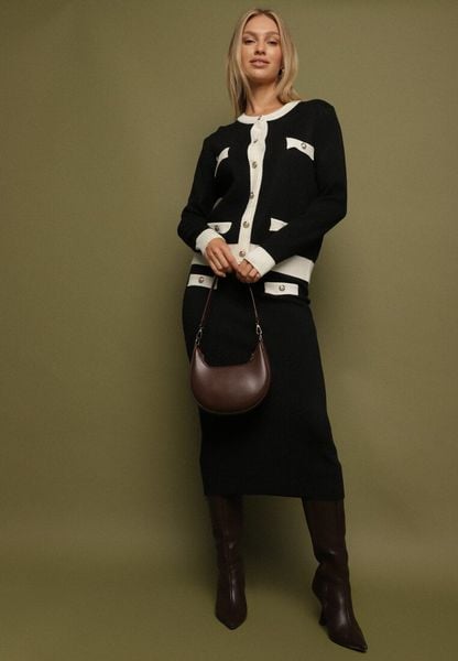 Czarno-Biały Dzianinowy Komplet Kardigan na Guziki i Rozkloszowana Spódnica Zemita